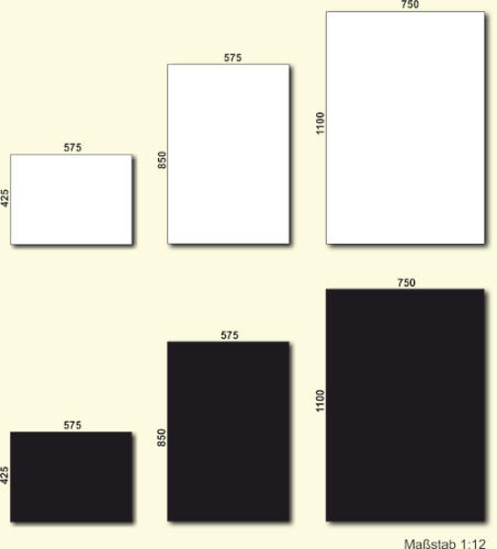 - Größen: 575 x 425 mm, 575 x 850 mm und 750 x 1100 mm